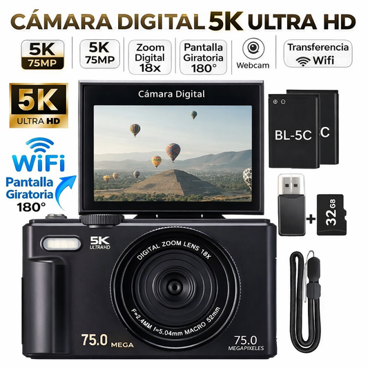 Cámara Digital 75MP 5K con Zoom 18X y Pantalla Giratoria